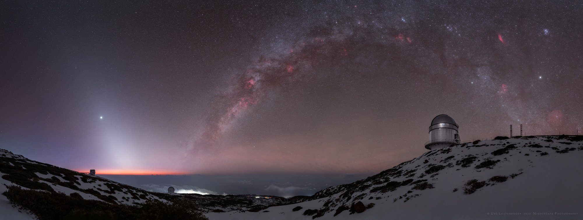 Landscape panorama near the NOT showing the Milky Way bow and zodiacal light
